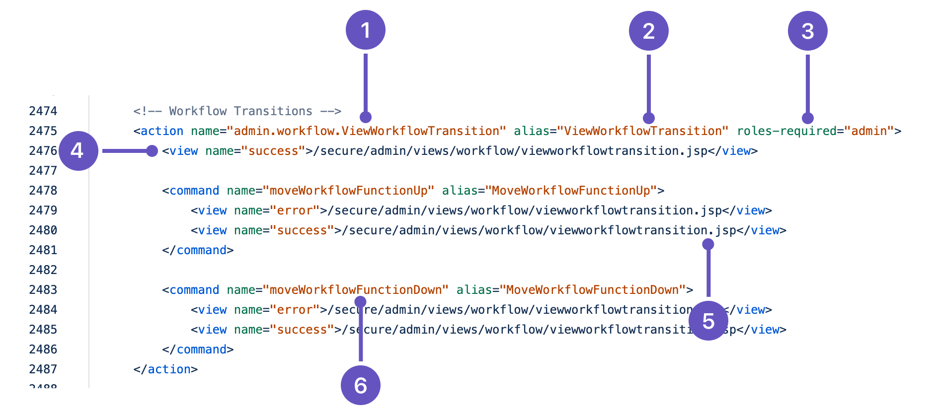 ViewWorkflowTransition.jspa.view name is a string returned from action to decide which view to show after action is invoked.!commandName suffix and implemented in the Action class as a doCommandName() method.Each action element has an alias attribute, which is the part of the URL that you see in a web browser. The name element is the name of the Java class that is used by the alias.
