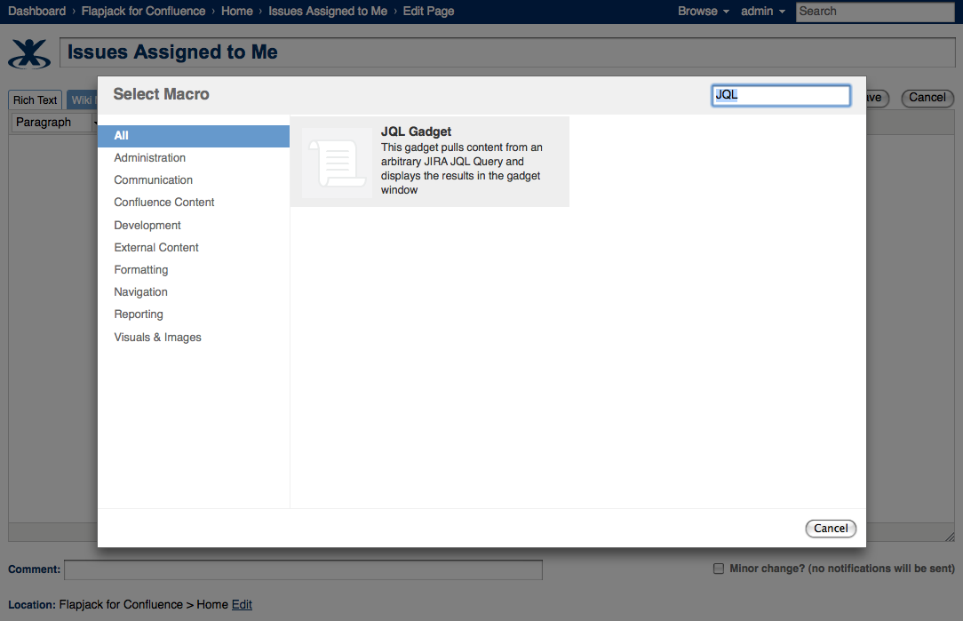 | Enter 'JQL Gadget'. |